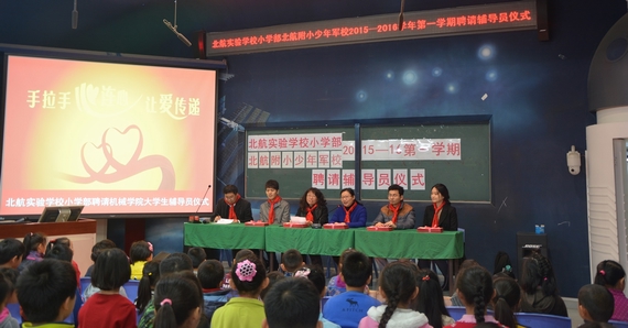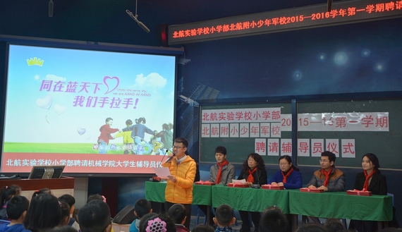 在到会领导为校外辅导员代表颁发聘书后,所有的辅导员找到自己配对的班级,在一片欢声笑语中被实验学校的小学生带进教室,机械学院北航实验学校校外辅导员的启动仪式顺利结束。